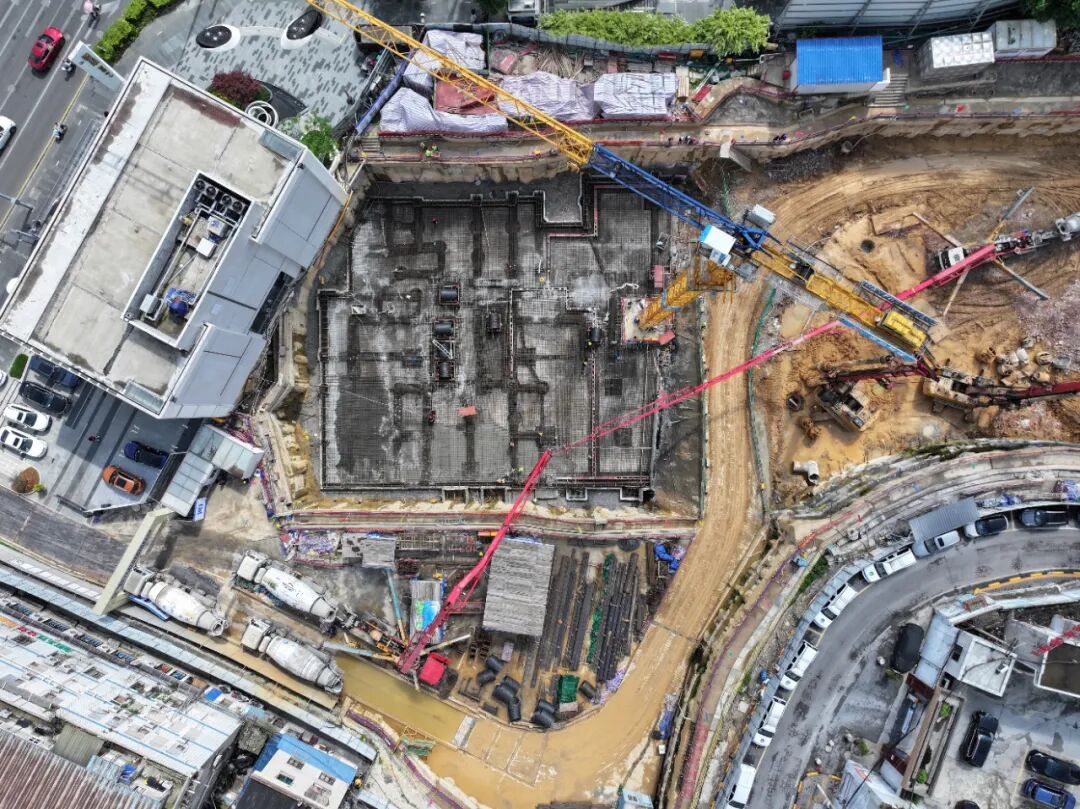 贵阳城投·毓翠项目位于贵阳市云岩区,总建筑面积约24.7万平方米,规划为集商业、办公、住宅于一体的城市综合体。项目规划建设6栋住宅,目前A、B、C号楼在建,此次率先完成底板工程施工的为A号楼,浇筑混凝土总量达1100立方米,采用C60P8等高强度抗渗混凝土。