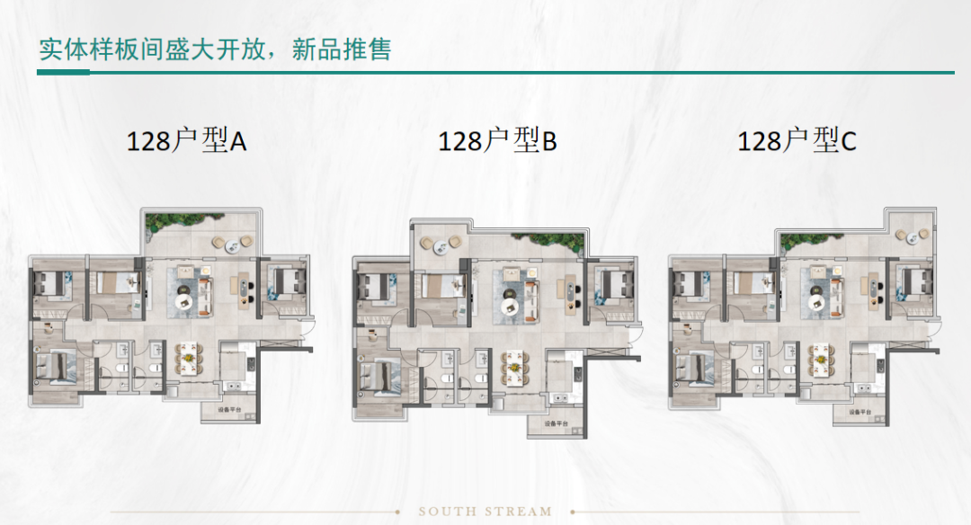 三大“0公摊”户型任选:128㎡户型赠送27㎡实用面积,实现“0公摊”,得房率达100%,真正做到“百分百空间,百分百生活”。每一户均伴露台而生,B、C户型更独享静谧露台,让诗意生活随时绽放。